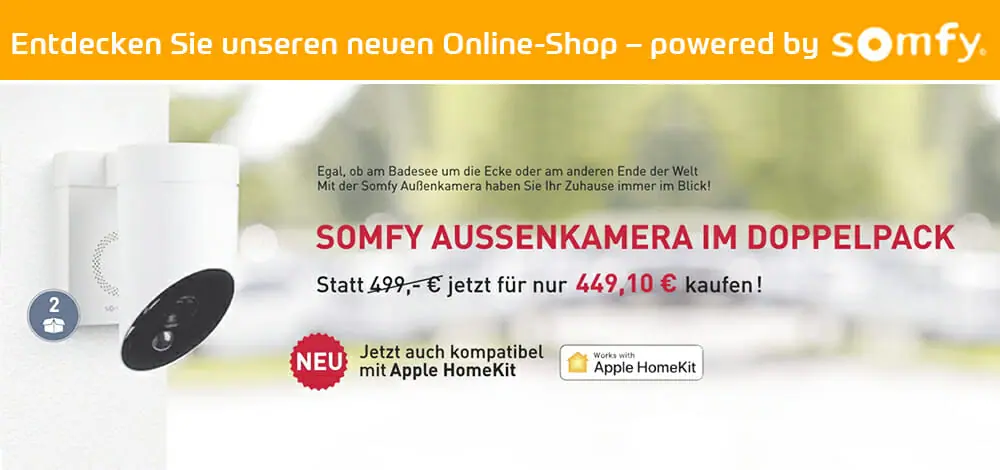 Sicherheit für Ihr zu Hause auch in Urlaubszeiten! Mit der somfy Außenkamera haben Sie auch am Urlaubsort ihre Wohnung stets im Blick – jetzt erhältlich im 2er Set zum Angebotspreis (gilt nur für Bestellungen über den Online-Shop!).